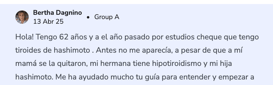«Soy de Uruguay, tengo 63 años y mis nietas crearon esta página para ayudar a más personas con mis conocimientos que recopilé en más de 25 años de estudio, práctica y conseguir la vida que siempre desee libre de síntomas… y tú, mi niña, que estás leyendo esto ahora… espero que así sea para ti también, créeme que no es casualidad que estés leyendo esto en este preciso momento. Yo sé lo que es que se nos caiga el cabello, levantarse a media noche con sudoración, no poder hacer ejercicio por las constantes taquicardias, incluso sé lo que es sentir que no puedes ni levantarte de la cama a pesar de haber dormido…ya pasé por eso…Y por eso quiero compartirte todo lo que hice para poner en remisión mi Hipotiroidismo de Hashimoto, yo estudié nutrición pero cuando nadie daba solución a mi problema me especialicé en balance hormonal y aunque ahora este jubilada, mis nietas me animaron a compartir esta Guía que vendía hace un tiempo porque una de ellas, mi nieta Sofía también fue diagnóstica y quizo compartir todo lo que le dije que hiciera para revertir esta condición. Ahora tú puedes tenerlo en tus manos y no te costará ni la mitad de todos los años y el dinero que invertí para dar con esto»